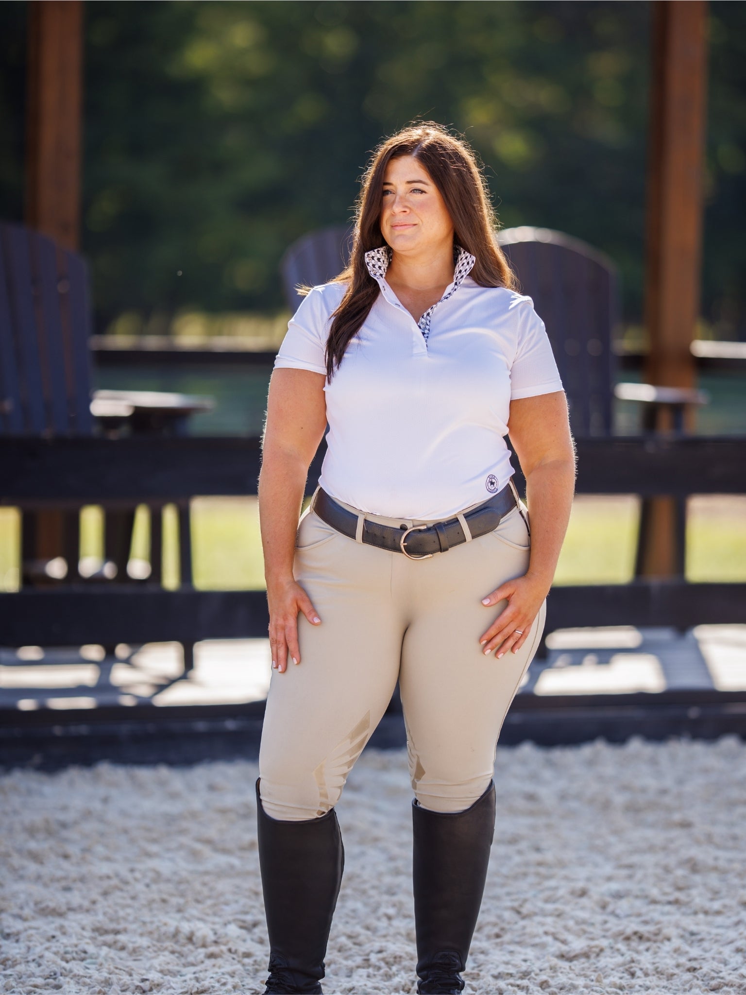 Our Talent Yarn® Show Shirt is the classic choice for looking crisp and polished in the show ring. Expertly tailored in easy pullover style with a gently tapered body fit for a neat appearance with or without your show coat. Unsnap the collar to show our exclusive fabric trim. Smart, thermoregulating technology helps maintain an optimal body temperature. Moisture-wicking and deodorizing antimicrobial properties provide quick-dry and stay-fresh benefits that never wash out. Stain resistance helps keep your shirt looking new wash after wash. Breathable, stretch Talent Yarn keeps you comfortable in the saddle even on the longest days.