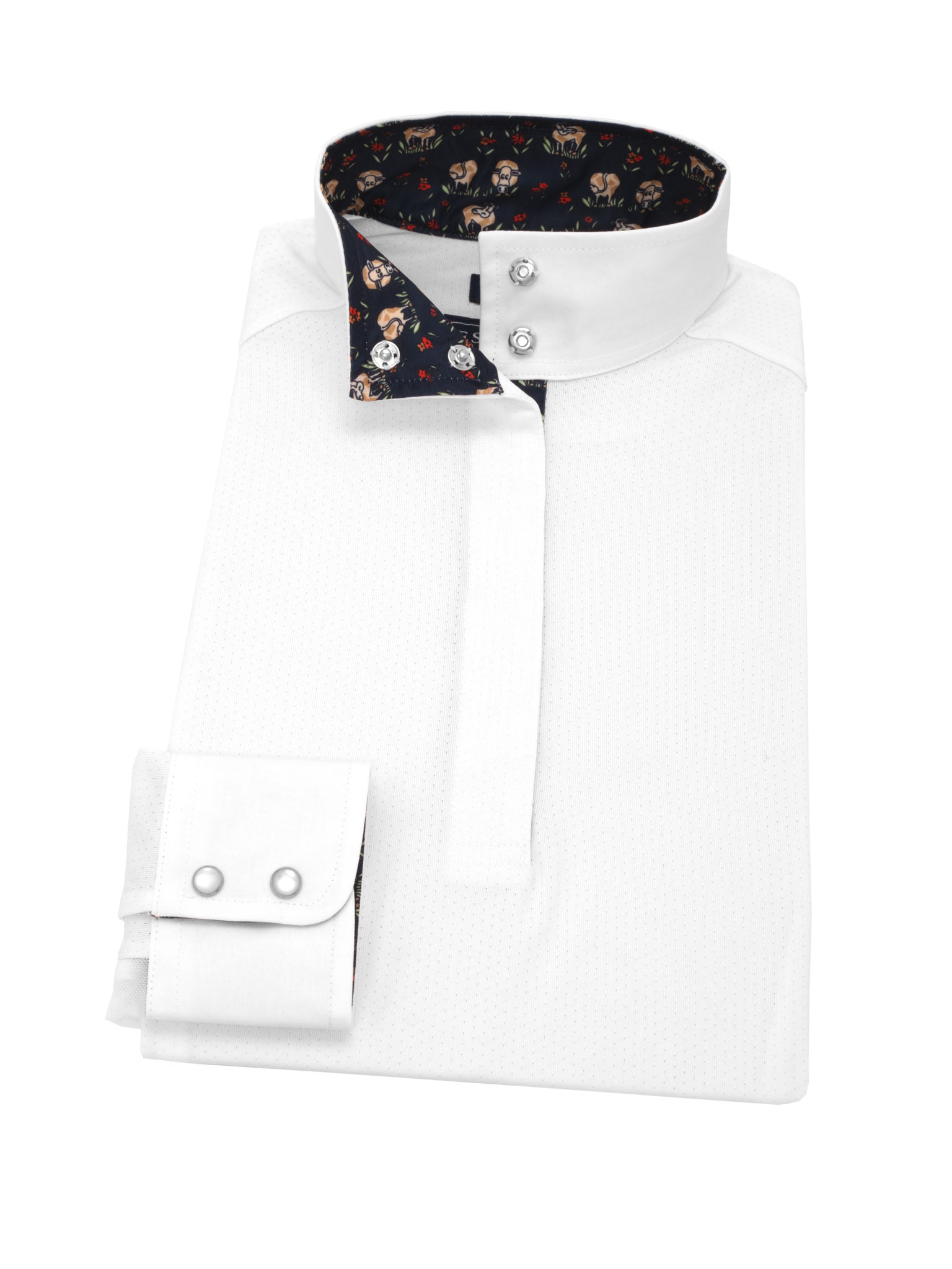 Our Talent Yarn® Show Shirt is the classic choice for looking crisp and polished in the show ring. Expertly tailored in easy pullover style with a gently tapered body fit for a neat appearance with or without your show coat. Unsnap the collar and turn back the cuffs to show our exclusive fabric trim. Smart, thermoregulating technology helps maintain an optimal body temperature. Moisture wicking and deodorizing antimicrobial properties provide quick dry and stay fresh benefits that never wash out. Stain resistance helps keep your shirt looking new wash after wash. Breathable, stretch Talent Yarn keeps you comfortable in the saddle even on the longest days.