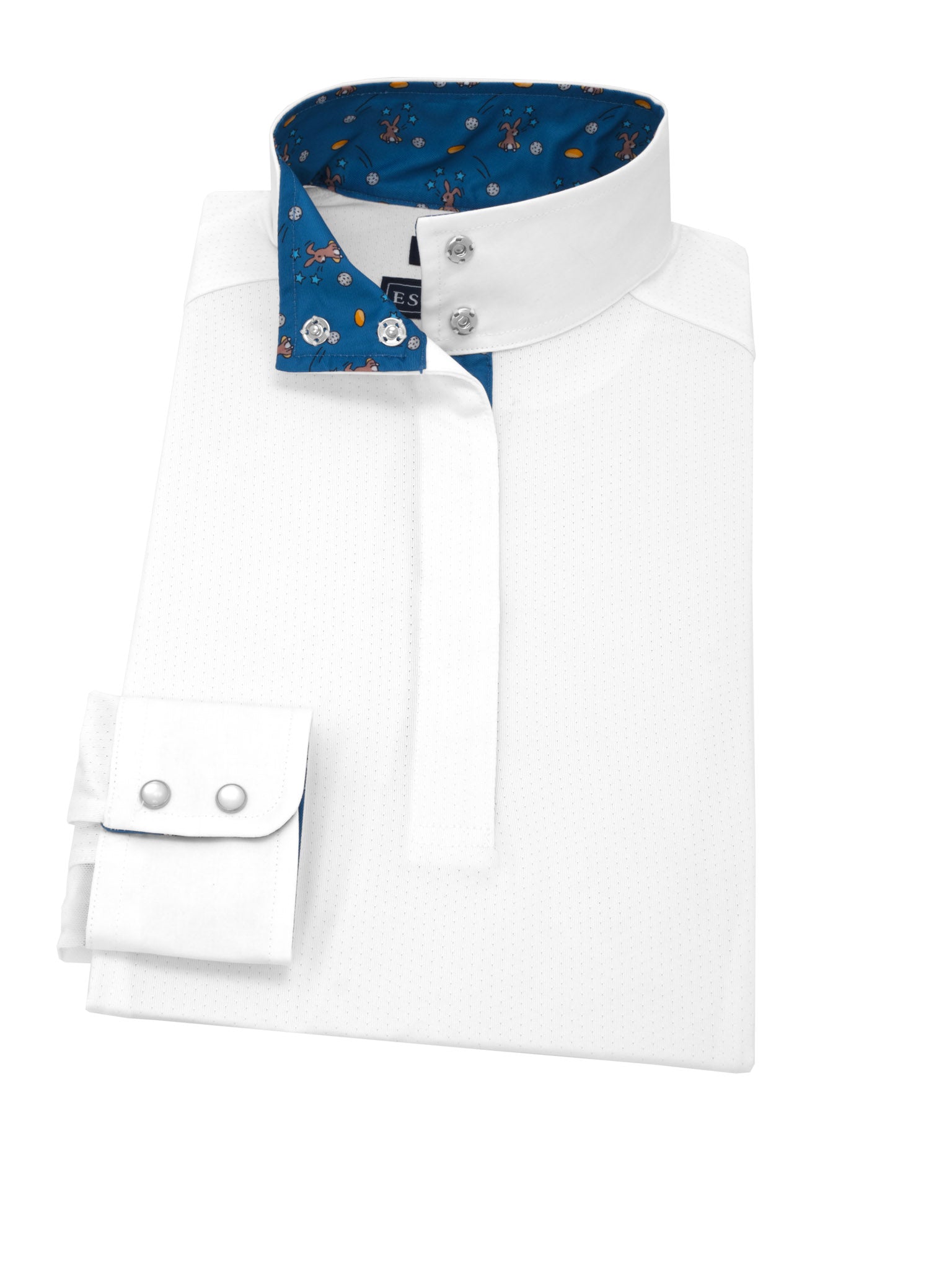Our Talent Yarn® Show Shirt is the classic choice for looking crisp and polished in the show ring. Expertly tailored in easy pullover style with a gently tapered body fit for a neat appearance with or without your show coat. Unsnap the collar and turn back the cuffs to show our exclusive fabric trim. Smart, thermoregulating technology helps maintain an optimal body temperature. Moisture wicking and deodorizing antimicrobial properties provide quick dry and stay fresh benefits that never wash out. Stain resistance helps keep your shirt looking new wash after wash. Breathable, stretch Talent Yarn keeps you comfortable in the saddle even on the longest days.