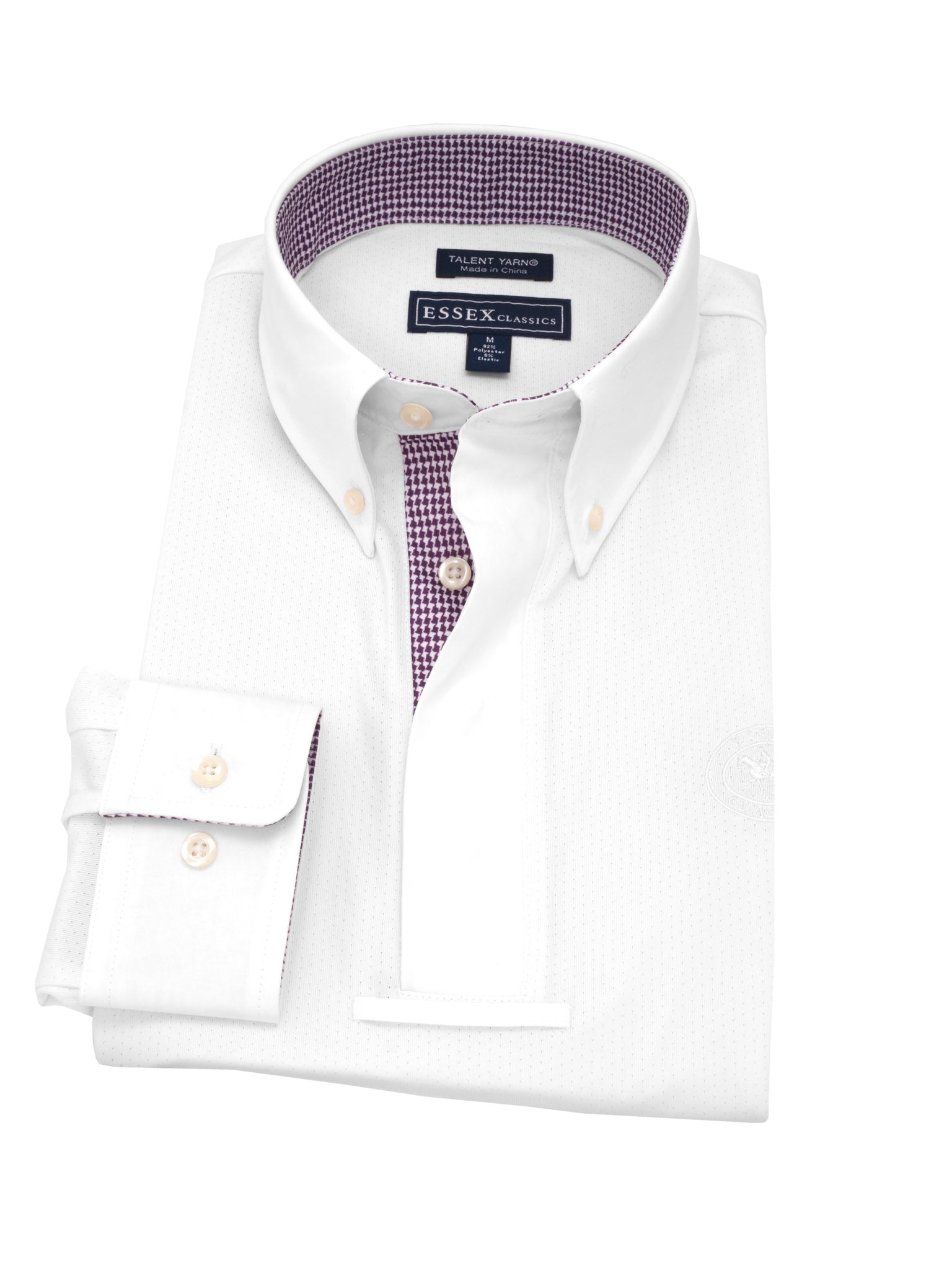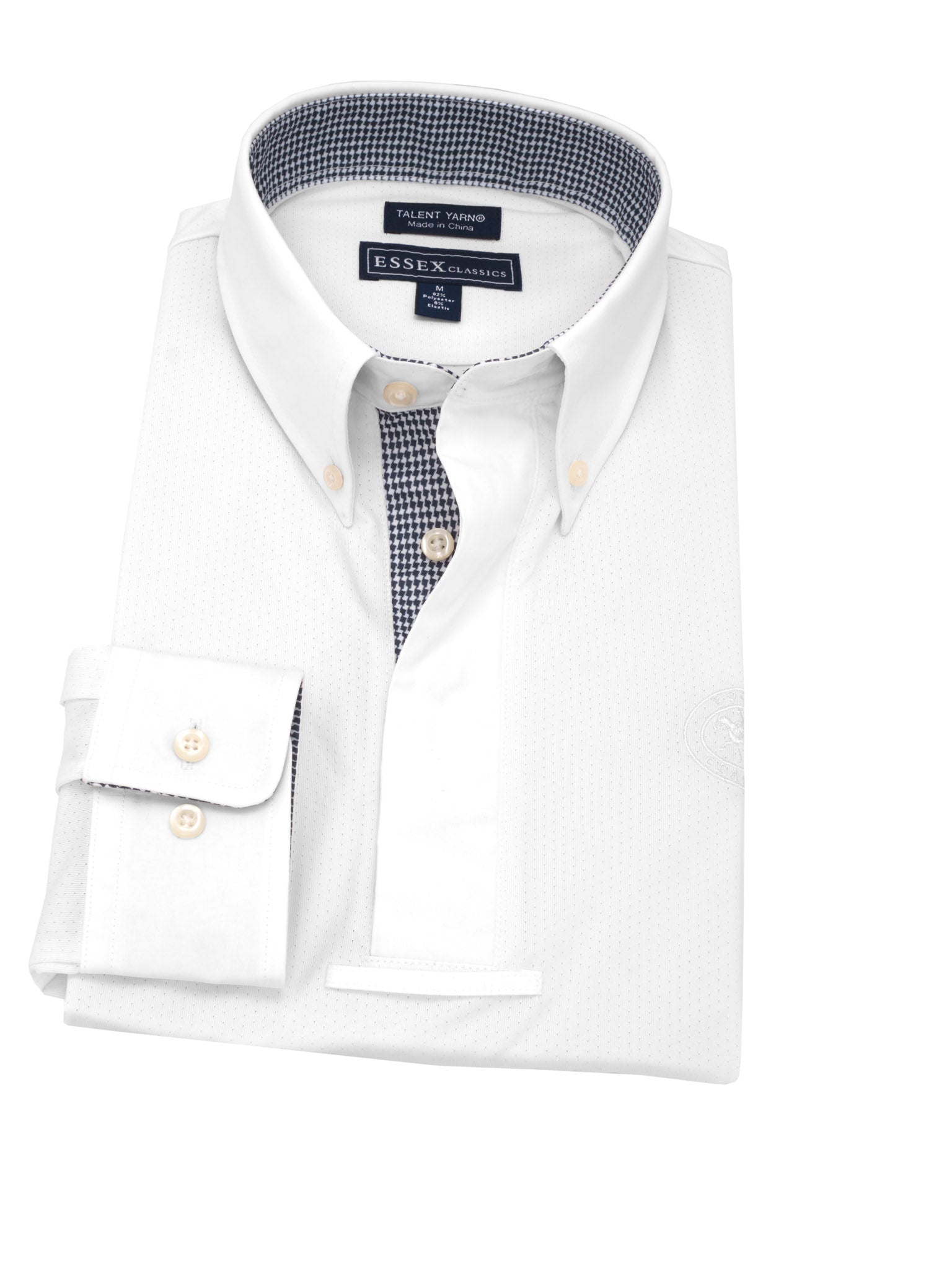 Our Talent Yarn® Show Shirt is the classic choice for looking crisp and polished in the show ring. Expertly tailored in an easy pullover style with a trim fit for a neat appearance with or without your show coat. Turn back the cuffs to show our exclusive fabric trim. Smart, thermoregulating technology helps maintain an optimal body temperature. Moisture wicking and deodorizing antimicrobial properties provide quick drying and stay fresh benefits that never wash out. Stain resistance helps keep your shirt looking new wash after wash. Breathable, stretch Talent Yarn keeps you comfortable in the saddle all day long.