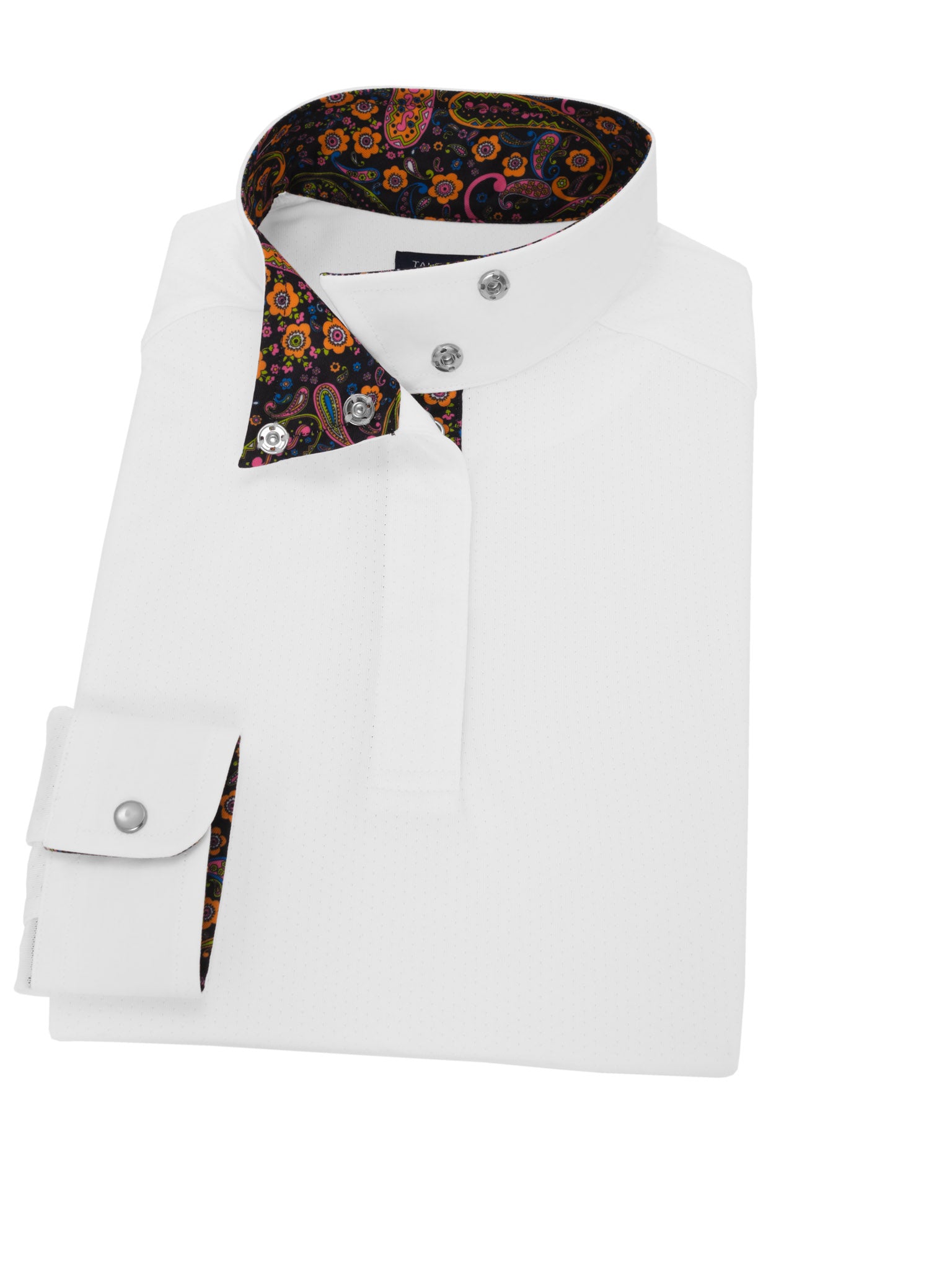 Our Talent Yarn® Show Shirt is the classic choice for looking crisp and polished in the show ring. Expertly tailored in easy pullover style with a gently tapered body fit for a neat appearance with or without your show coat. Unsnap the collar and turn back the cuffs to show our exclusive fabric trim. Smart, thermoregulating technology helps maintain an optimal body temperature. Moisture wicking and deodorizing antimicrobial properties provide quick dry and stay fresh benefits that never wash out. Stain resistance helps keep your shirt looking new wash after wash. Breathable, stretch Talent Yarn keeps you comfortable in the saddle even on the longest days.