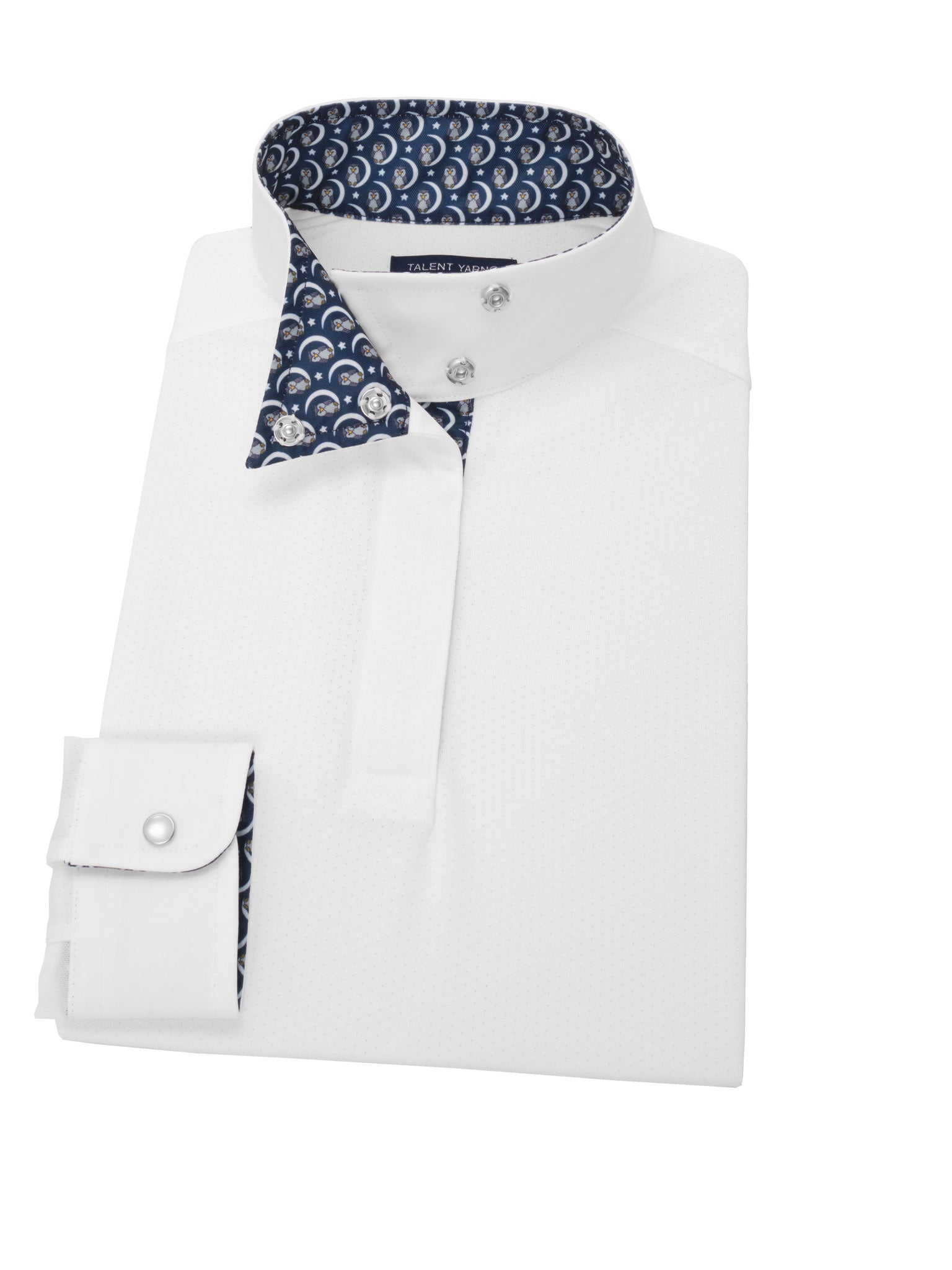 Our Talent Yarn® Show Shirt is the classic choice for looking crisp and polished in the show ring. Expertly tailored in easy pullover style with a gently tapered body fit for a neat appearance with or without your show coat. Unsnap the collar and turn back the cuffs to show our exclusive fabric trim. Smart, thermoregulating technology helps maintain an optimal body temperature. Moisture wicking and deodorizing antimicrobial properties provide quick dry and stay fresh benefits that never wash out. Stain resistance helps keep your shirt looking new wash after wash. Breathable, stretch Talent Yarn keeps you comfortable in the saddle even on the longest days.