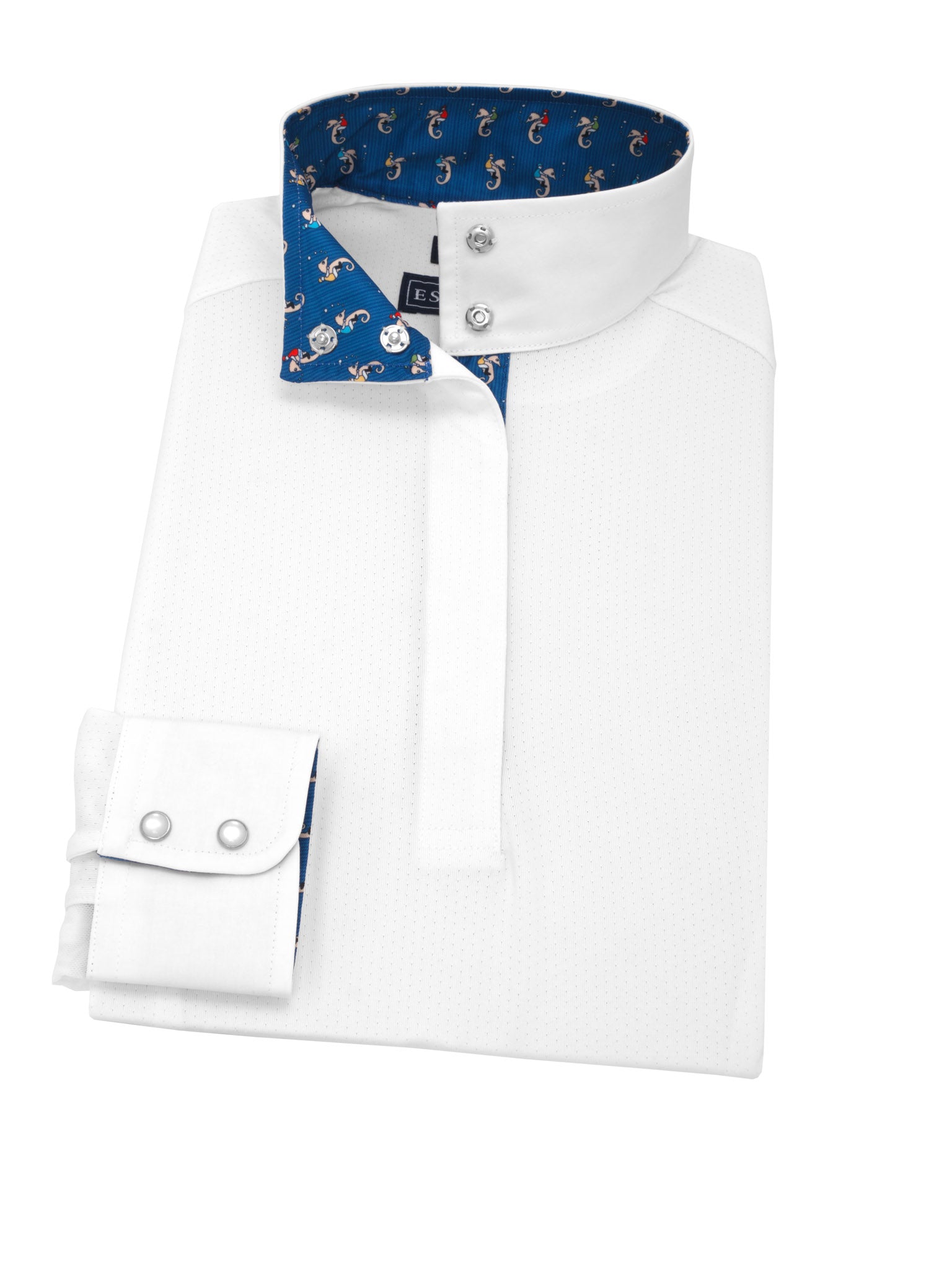 Our Talent Yarn® Show Shirt is the classic choice for looking crisp and polished in the show ring. Expertly tailored in easy pullover style with a gently tapered body fit for a neat appearance with or without your show coat. Unsnap the collar and turn back the cuffs to show our exclusive fabric trim. Smart, thermoregulating technology helps maintain an optimal body temperature. Moisture wicking and deodorizing antimicrobial properties provide quick dry and stay fresh benefits that never wash out. Stain resistance helps keep your shirt looking new wash after wash. Breathable, stretch Talent Yarn keeps you comfortable in the saddle even on the longest days.