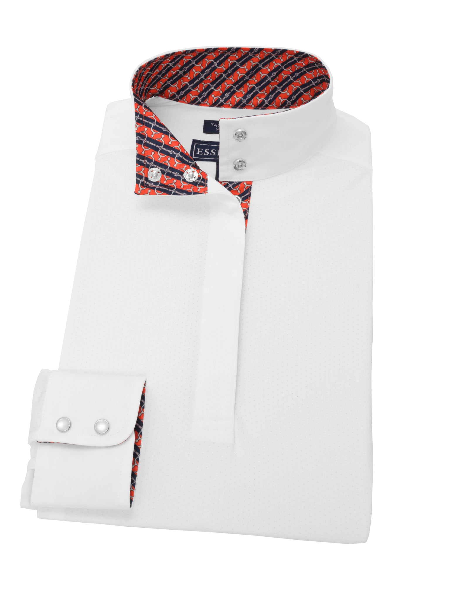 Our Talent Yarn® Show Shirt is the classic choice for looking crisp and polished in the show ring. Expertly tailored in easy pullover style with a gently tapered body fit for a neat appearance with or without your show coat. Unsnap the collar and turn back the cuffs to show our exclusive fabric trim. Smart, thermoregulating technology helps maintain an optimal body temperature. Moisture wicking and deodorizing antimicrobial properties provide quick dry and stay fresh benefits that never wash out. Stain resistance helps keep your shirt looking new wash after wash. Breathable, stretch Talent Yarn keeps you comfortable in the saddle even on the longest days.